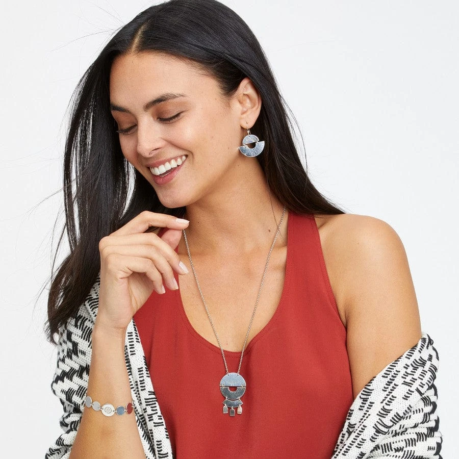 With a fresh twist on geometric motifs, this exotic collection includes sun-inspired shapes representing the setting sun of Morocco. This tiered necklace is an eclectic mix of polished, etched and hammered finishes.