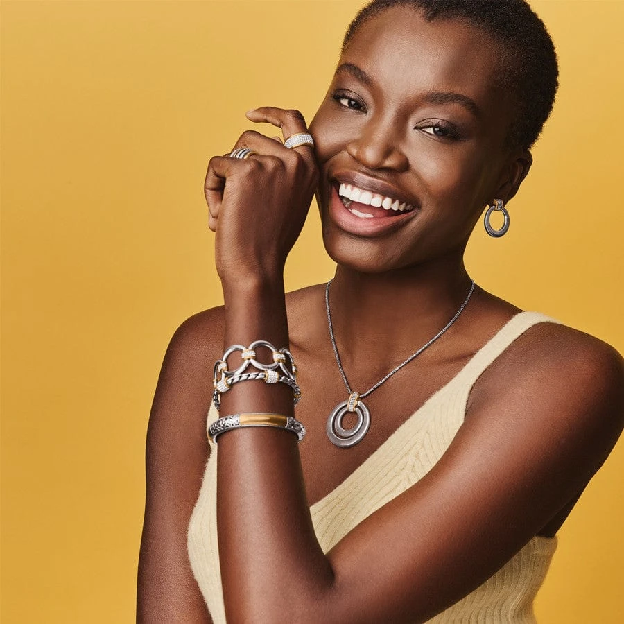 Inspired by the conductor in an orchestra who speaks without words to keep the tempo perfect, this jewelry with smooth polished rings gives texture and brilliance to your Meridian look.