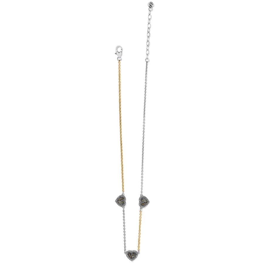 Inspired by the mystique of Neptune, this delicate silver and gold heart station necklace uses the familiar two-tone “rings” to create a pillow shaped “woven” design. Fine crystals adorn the perimeter of each station imbuing a classic refined quality.