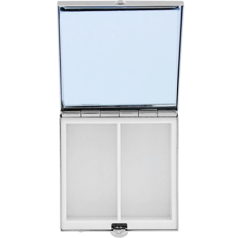 This silvery etched pill box with opalescent insert is breathtakingly beautiful. Features an interior mirror and pressure release opening for ease and convenience!