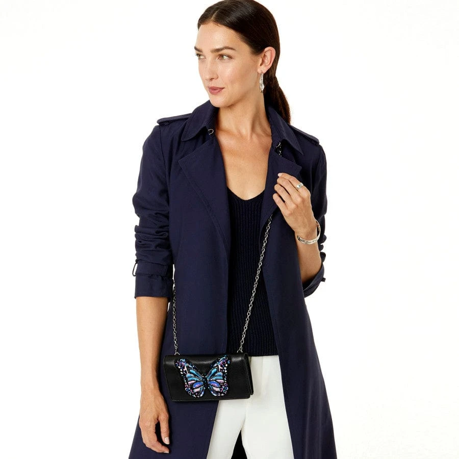 A brilliant hand-beaded butterfly adorns this luxuriously soft clutch wallet, giving your outfit an airy uplifting vibe. Its crossbody strap goes from day to night with ease.